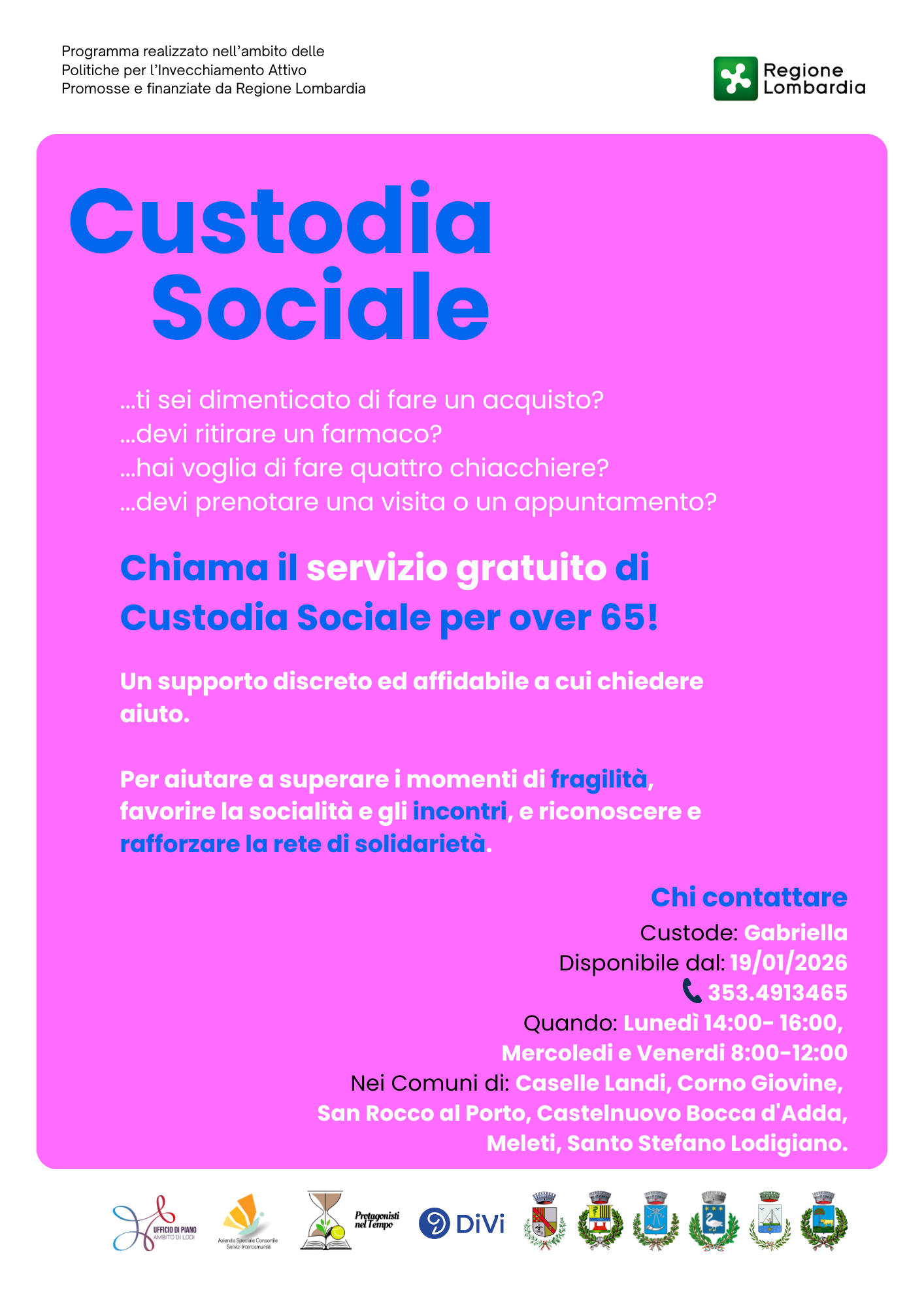 Dal 19 gennaio 2026 sarà attivo il servizio sperimentale di custodia sociale, finanziato da Regione Lombardia.